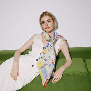 I used this scarf as a belt with my white dress and boots for a mirror check before heading out, and it tied everything together nicely. The mix of icons like ferries and landmarks adds a whimsical touch that elevates a plain look. It's easy to adjust and doesn't bunch up, making getting ready quicker and more fun.