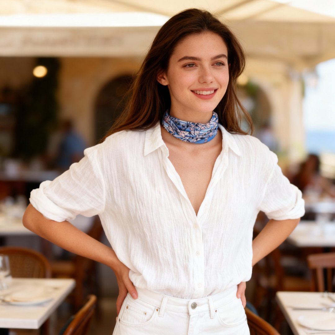 • Multi-style versatility: neck scarf, headscarf, hair tie, bag accessory