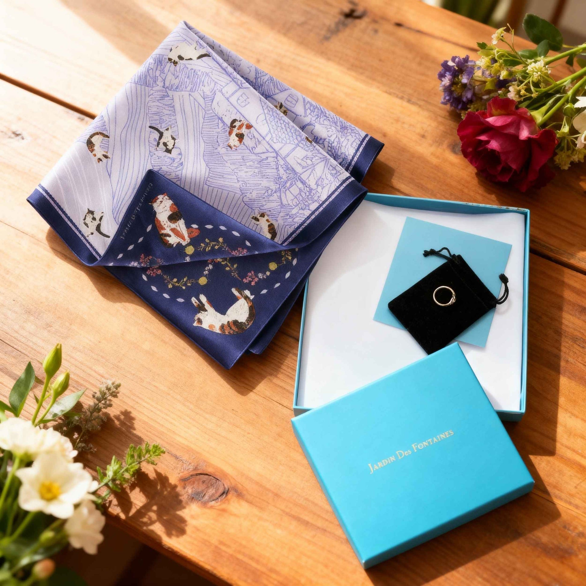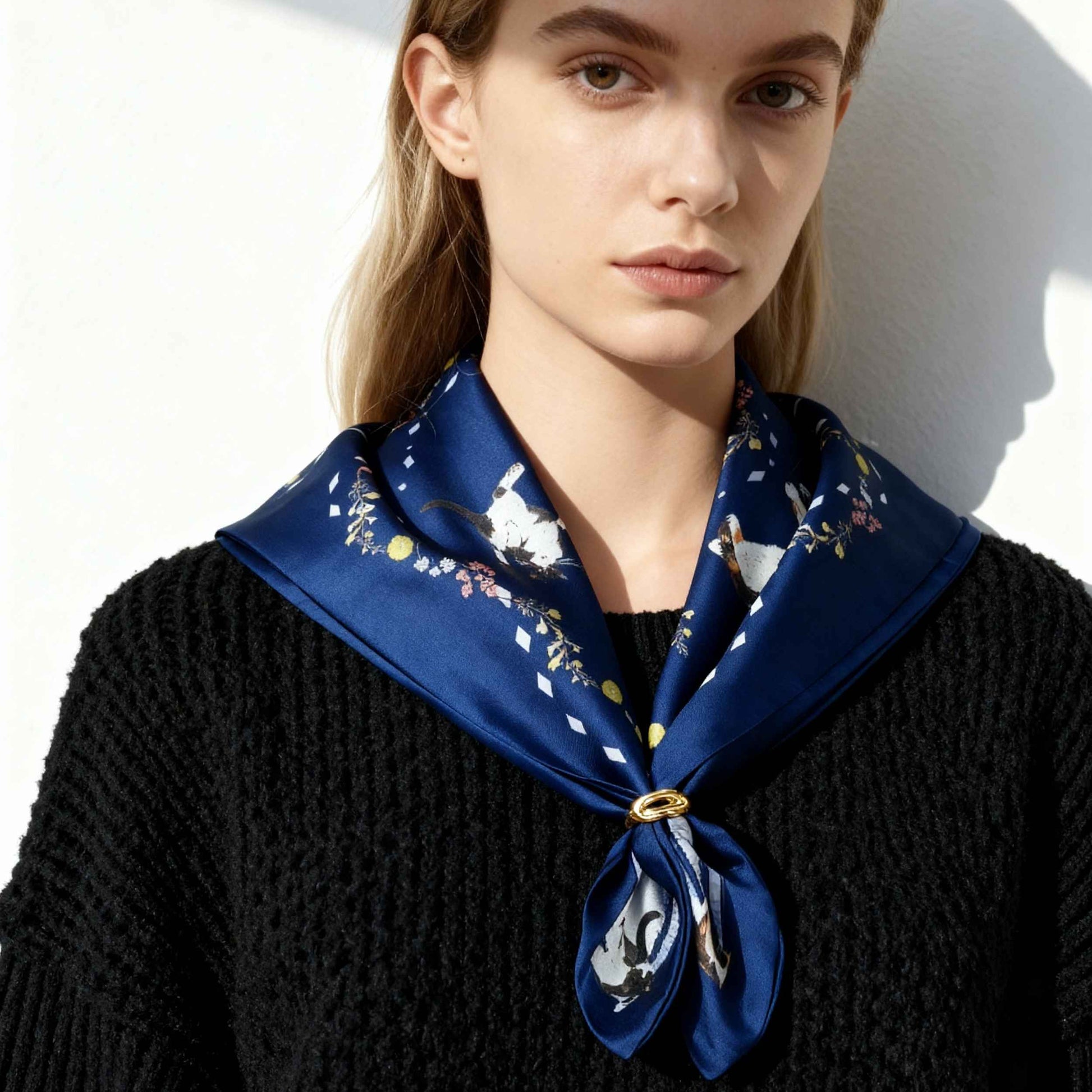 Yogis Cat and Flower Navy Tatra Mountain Silky Scarf Gift Set (Double Face Silky Scarf and Scarf Ring)