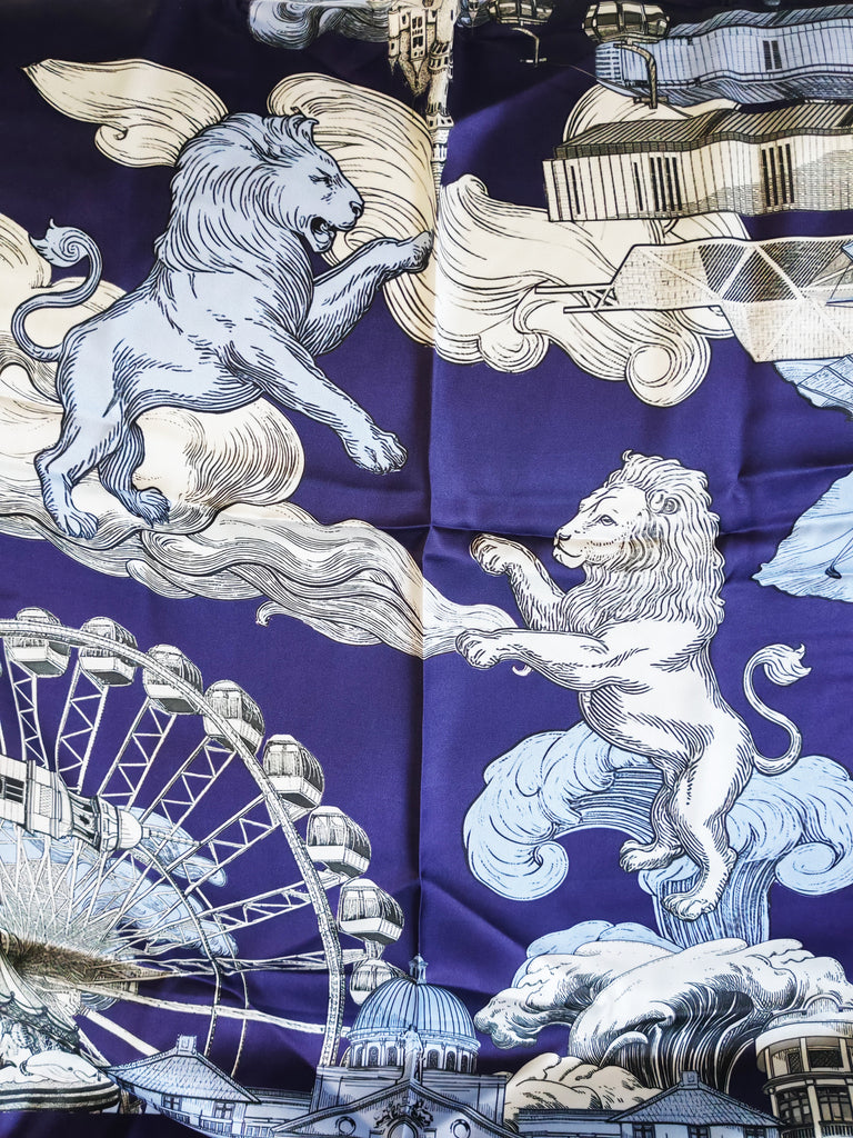 攤開這條絲巾,我對圖案的細膩細節驚嘆—獅子、摩天輪和所有香港景點都活了起來。絲質有奢華的重量和光澤,讓它感覺特別。目前我用它當沙發披巾,但它渴望被戴出去。就像擁有一件可穿戴的藝術品,講述故事。